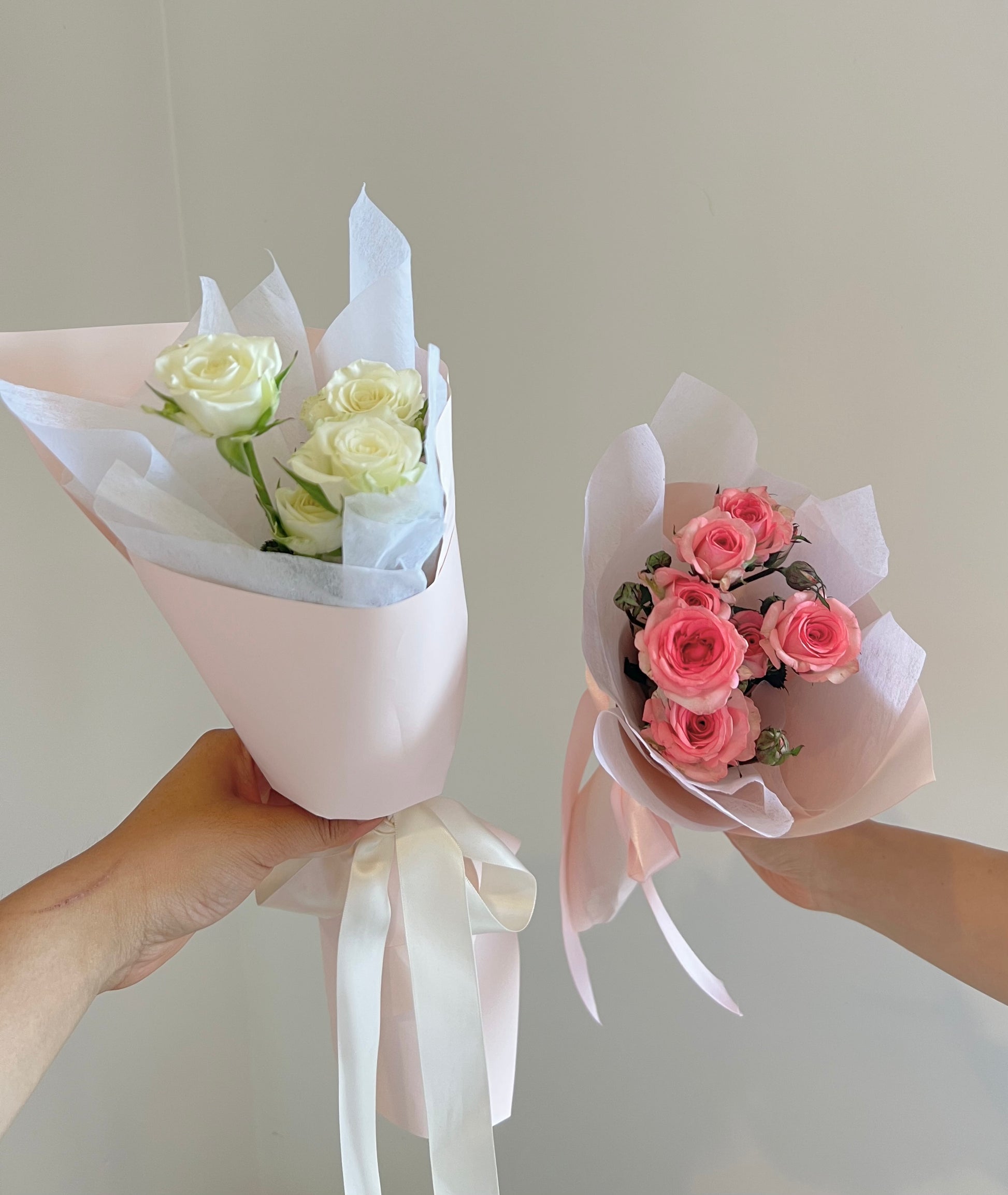 Our mini rose bouquets are perfect to gift friends or express your feelings to that one crush. Featuring spray roses in both pink and white shades and wrapped in our specialty wrapping paper. These are cute and fun mini bouquets to celebrate love and friendship!